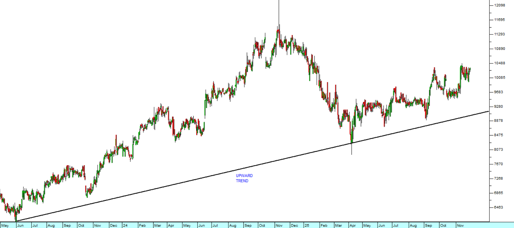 Anglovaal Industries produces and markets a range of food, cosmetic and clothing products with well-known brand names like Provita, Yardley, Spitz and I&J fish. This makes it very sensitive to the level of consumer demand in the economy and the strength of Festive Season sales. The Chairman commented on the 4 months of trading ending on 31st October 2025 saying, “I&J fishing delivered a stronger performance with improved catch rates, incremental benefits from the new freezer vessel, lower fuel prices, a favourable product mix and sound demand from international markets.” In our view, this is a well-managed blue-chip company which was moving sideways until June 2024 and then began to climb. Consider the chart: