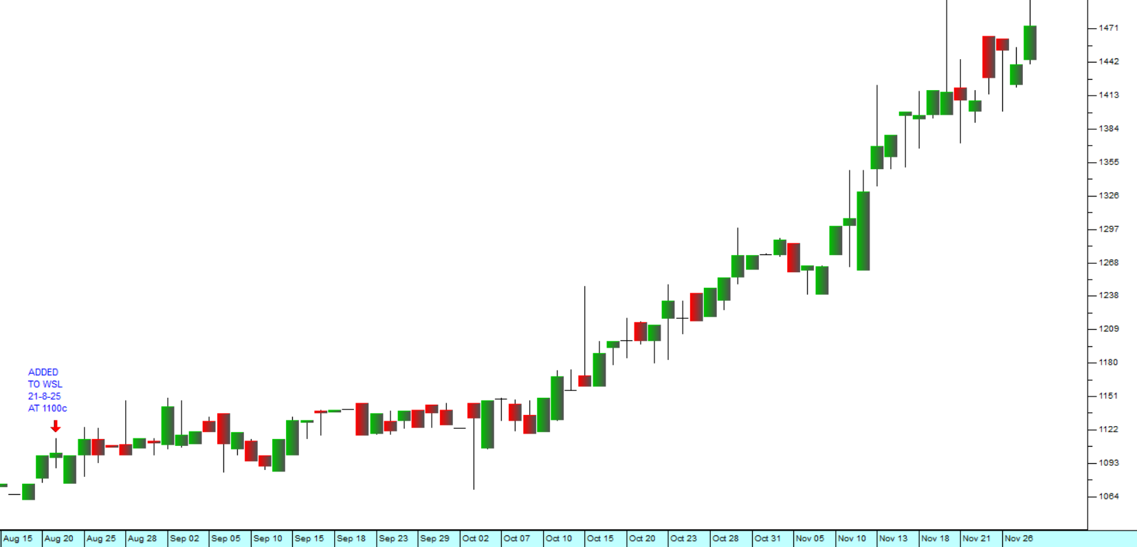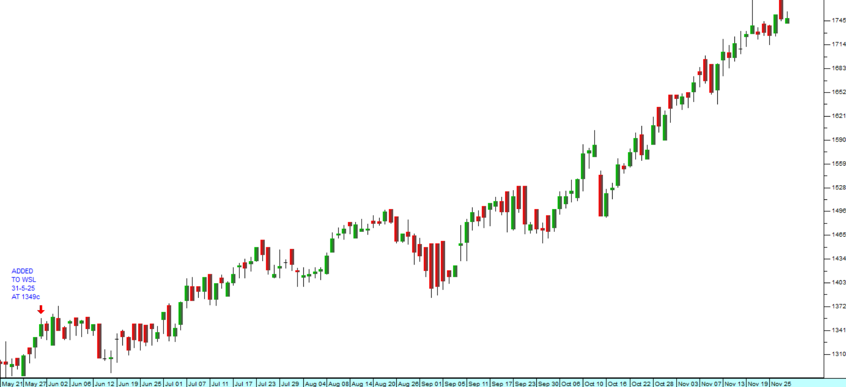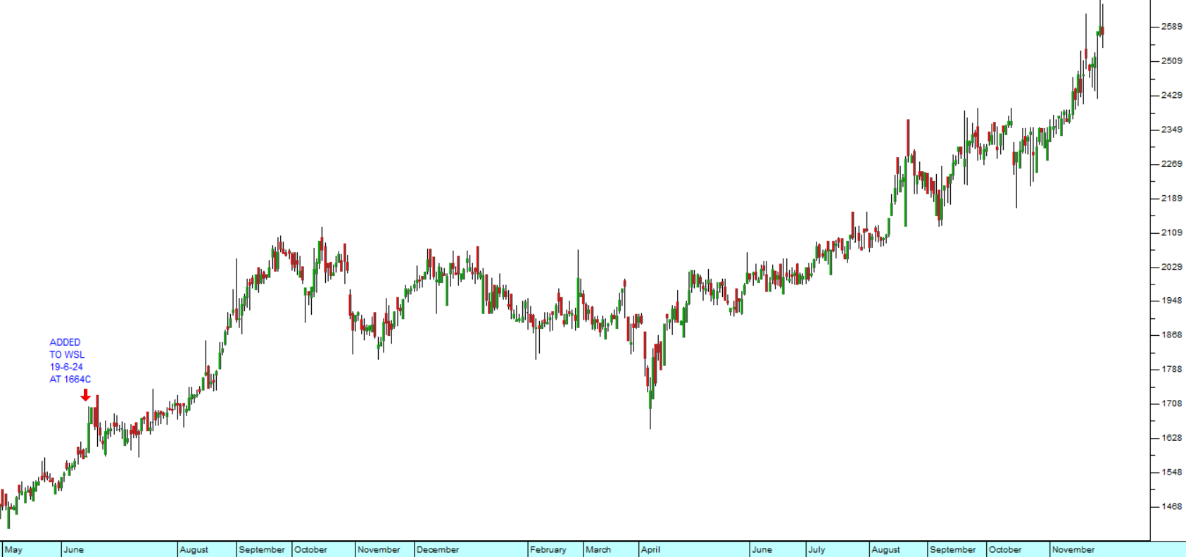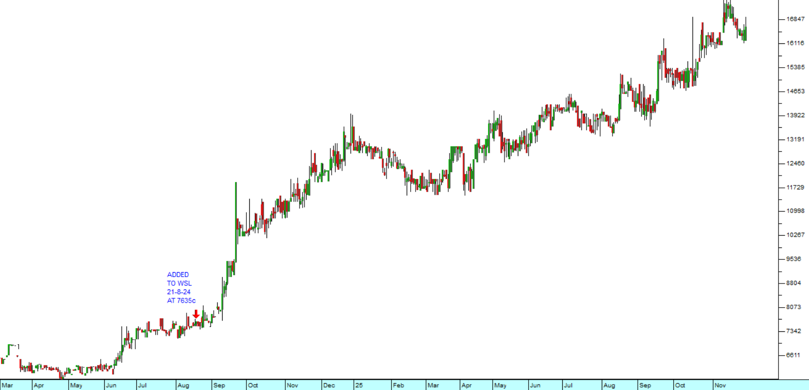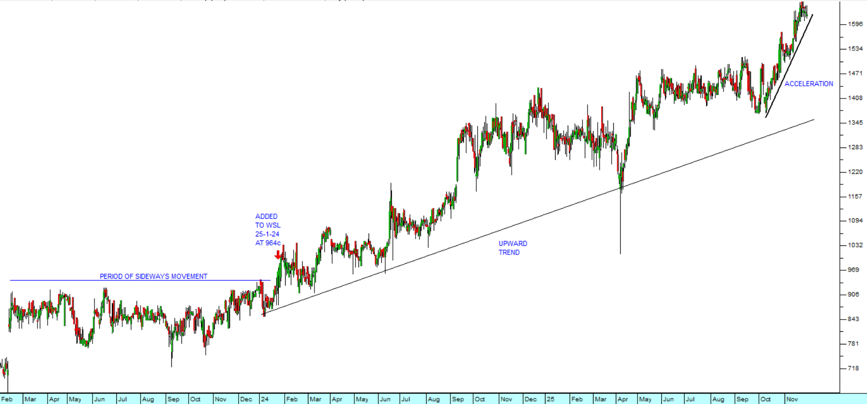 This company is a producer of food products that was unbundled from Brait and listed on 24th March 2023. For a long time after its listing the share was range-bound edging up. And then from the middle of June 2024, the market began to recognise its value. We added it to the Winning Shares List (WSL) on 21st August 2024 at a price of 7635c and since then it has risen to 16657c – a gain of 118% in about 15 months. Consider the chart: