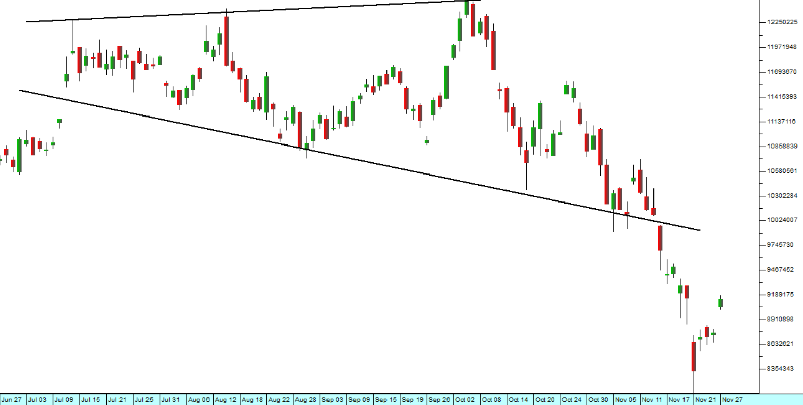 The collapse of the Bitcoin price shows just how sensitive crypto-currencies are to investor sentiment. During October and the first half of November, Bitcoin fell from a high of $125265 on the 6th of October 2025, to a low of $83268 on the 21st of November. The shift to risk-off among international investors during this period hammered Bitcoin down 33%. Now that the bulls are busy “buying the dip” on Wall Street, Bitcoin has recovered nearly 10% from its low, but it is still not “out of the woods” - consider the chart: