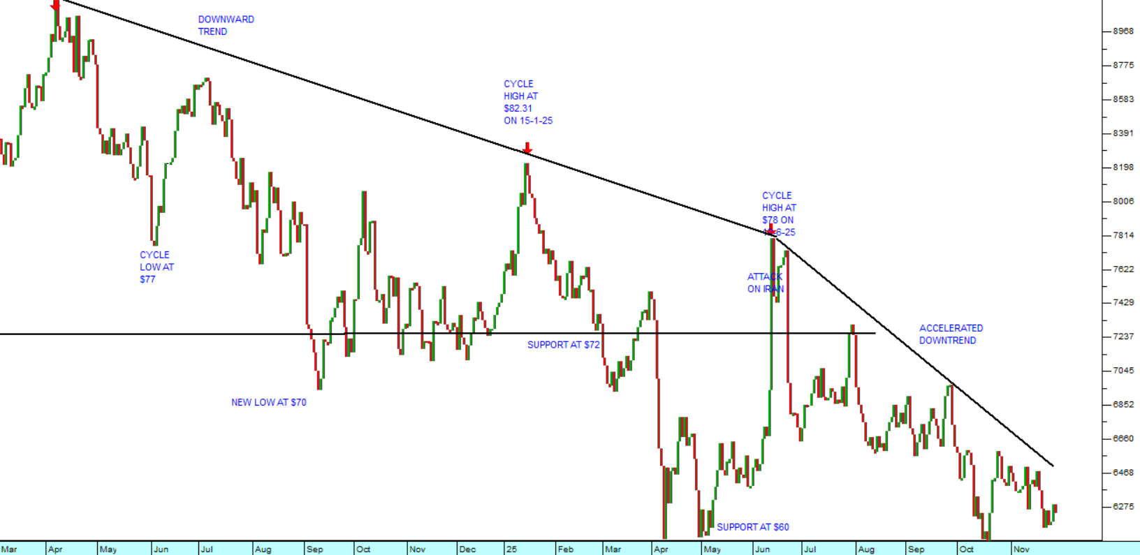 Russia’s revenue from oil and gas dropped by 27% year-over-year in October 2025. The price of Urals Crude oil dropped to $36.60 in October 2025 – a $23.50 discount to Brent. And Brent oil itself is in a downward trend that has it close to the support level at $60 per barrel. Consider the chart: