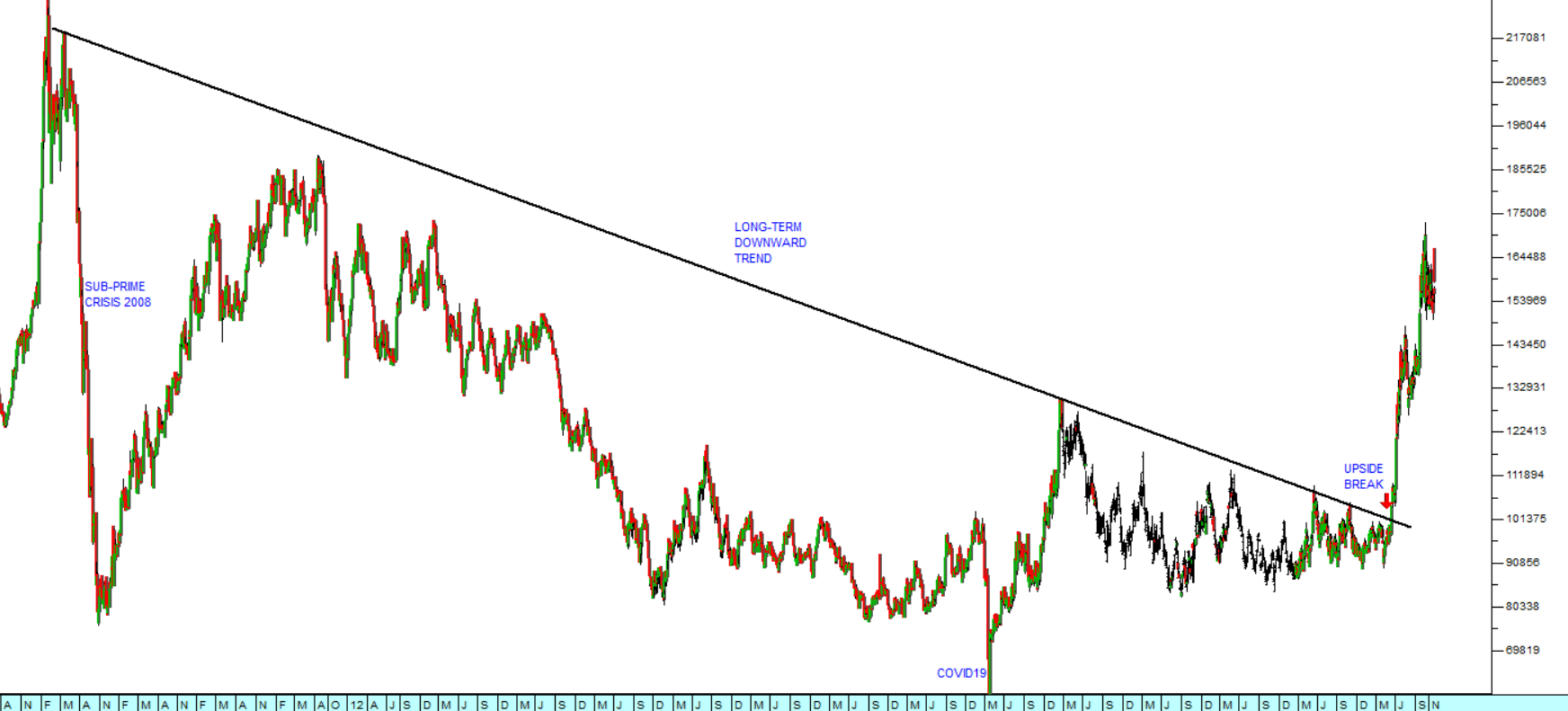 The chart shows the long-term downward trend in the platinum price which came to an abrupt end in May 2025. We expect it to continue performing well. Palladium and other platinum group metals (PGM) have also seen significant price increases.