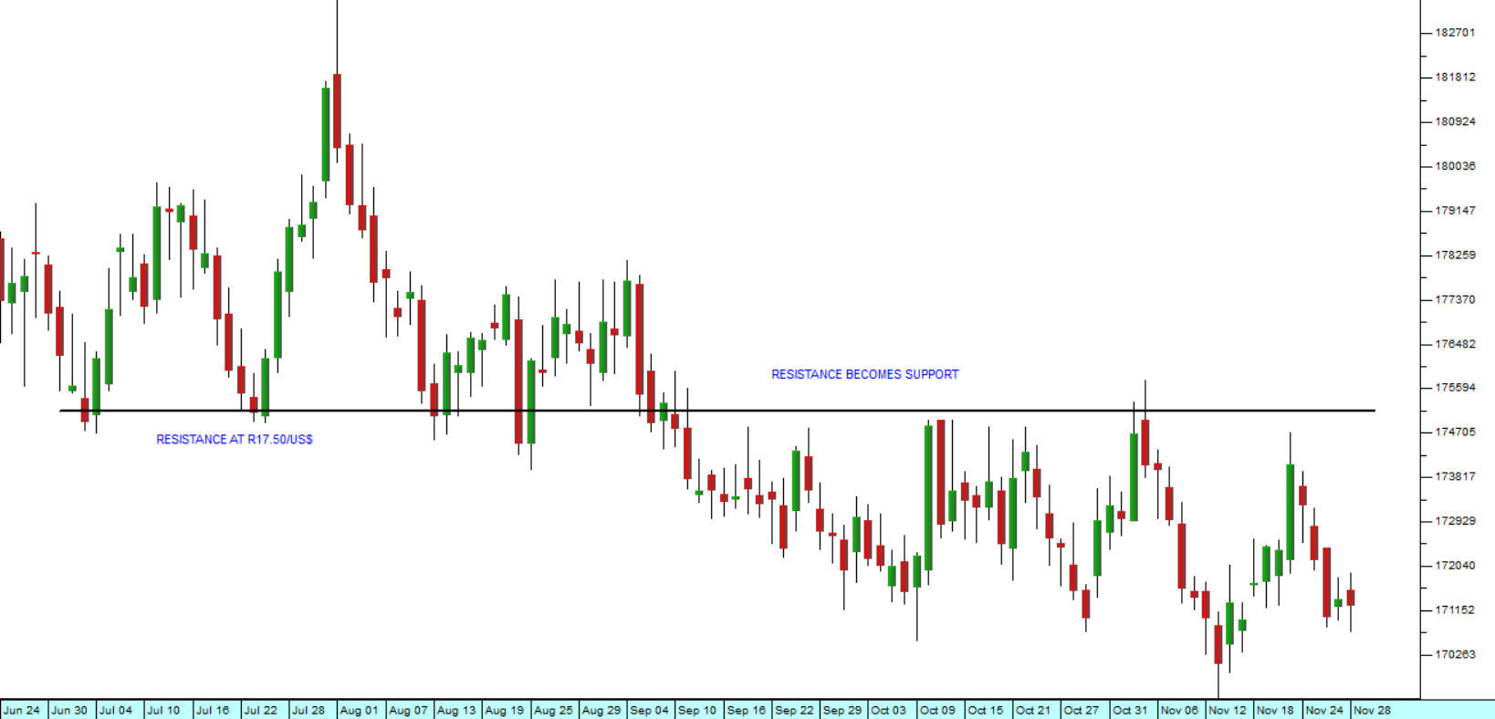 Last month, on 5th November 2025, the date of the previous Confidential Report, the rand had weakened back to the support level at R17.50 to the US dollar. That level, which was previously a resistance level has now become a support level. Over the month, our currency has strengthened back to a new intraday cyclical low of R16.93 on the 13th of November 2025. The rand then weakened back towards the support level before finding new strength in the last week. Consider the chart: