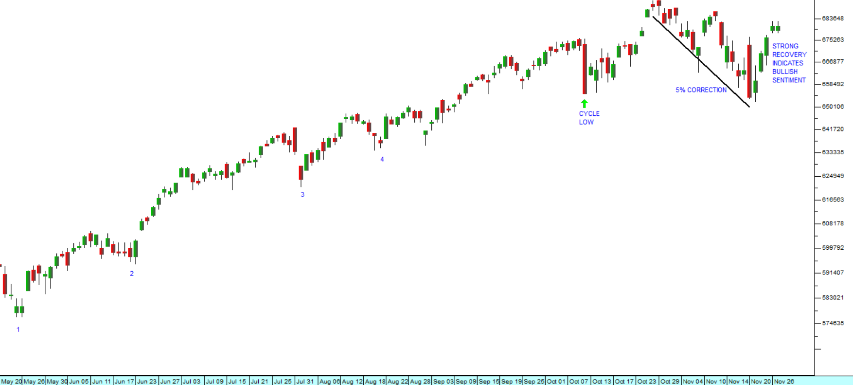 At the time of last month's Confidential Report on the 29th of October 2025, the S&P500 index was at an all-time record high of 6890. We had already warned of the possibility of a correction in our article “Bubble” published the week before on the 27th of October. Over the following month that correction has played out with Wall Street falling 5% and the S&P making a cycle low of 6538 on 20th November 2025. The correction was about double the size of the other mini-corrections (marked 1-4 on the chart) that we have experienced over the last 6 months. After displaying some nervousness, the bulls came roaring back last week furiously “buying the dip” and they drove the S&P back up to 6849 on Friday. Consider the chart: