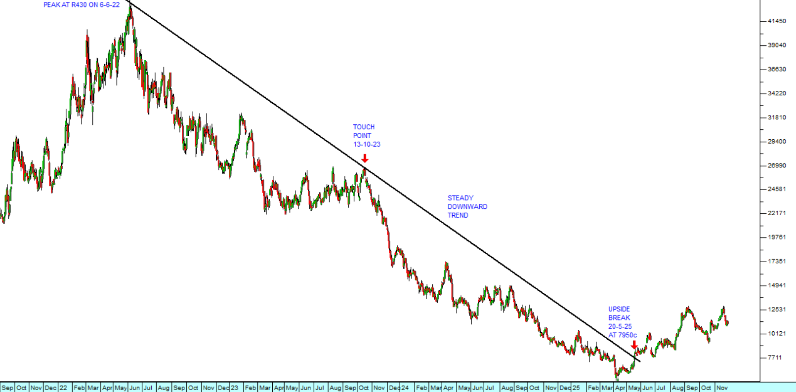 The Sasol share price is a very good example of the use of trendlines. From its peak on 6th June 2022 at R430, the share has been falling. The downward trend was well clarified by a downward trend line through its cycle high and touch point on 13th October 2023. These two points defined the trendline and the upside break came on 20th May 2025 at a price of 7950c. Consider the chart: