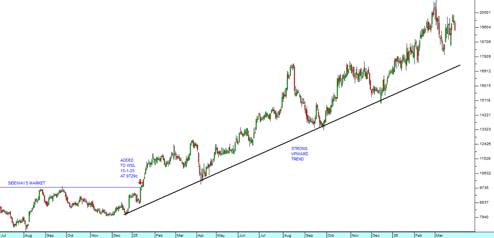 As you can see, MTN broke up out of an extended sideways pattern at the beginning of 2025 and has been trending up since then. We added it to the Winning Shares List (WSL) on 15th January 2025 at a price of 9729c. It has since risen to 19460c – in other words the share price has doubled in about 15 months.