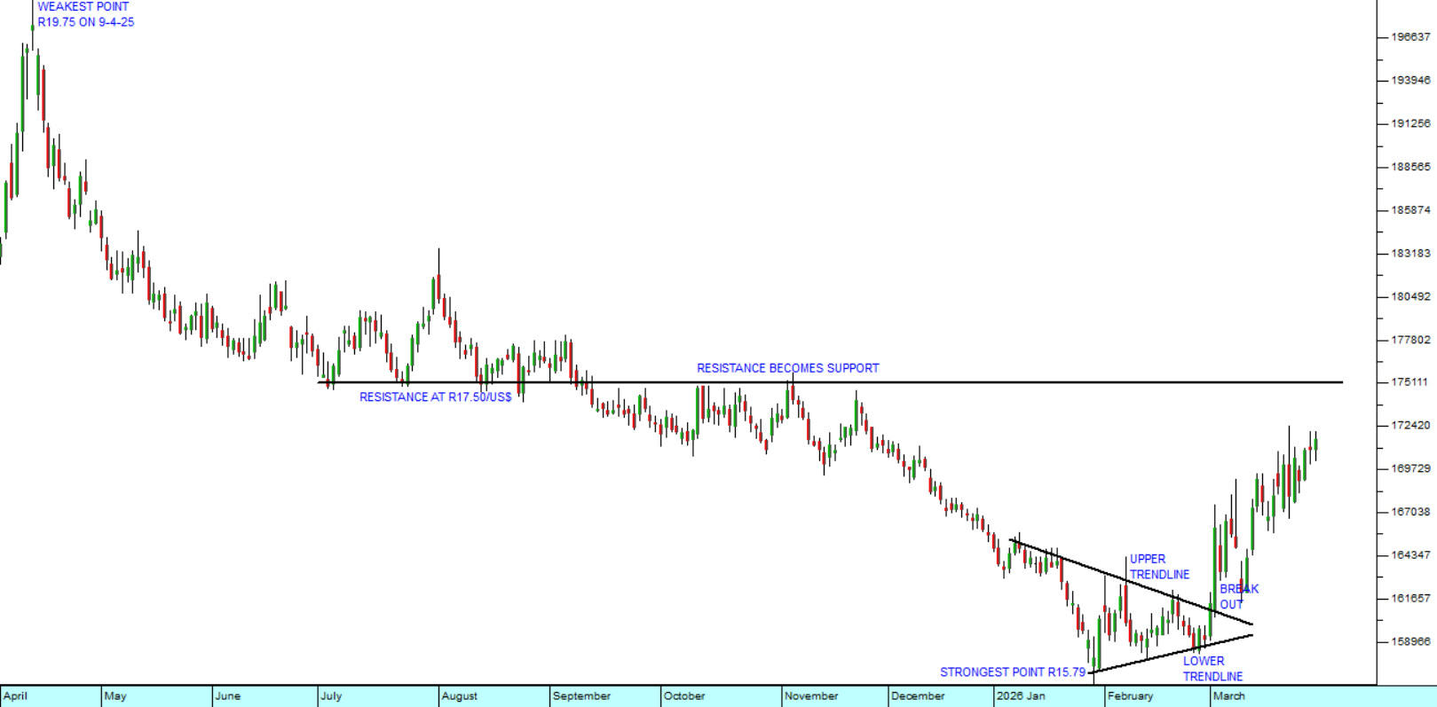 As you can see the area around R16 to the US$ was a critical area and a triangle formed. This triangle was broken when the war with Iran began. As you would expect there was a rapid move away from risk-on and towards risk-off with international investors dumping emerging market assets and moving into safe havens like the US dollar. The rand weakened breaking out of the triangle – but not as far as you would expect. It was protected to some extent by the underlying pattern of strength which had prevailed since April 2025. So far it has not even penetrated the support line at R17,50 and is showing great resilience.