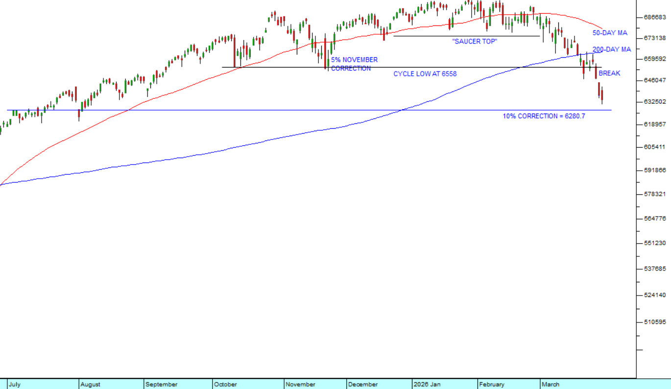 The chart below shows the progress of the S&P500 index from August last year to date. As you can see, the index has completed what technicians call a saucer top formation, part of which was a relatively weak head-and-shoulders formation. You will notice that the previous cycle low, after last November’s 5% correction, created something of a support level at 6558. That was smashed in the last two days of last week when Trump doubled down on his aggression toward Iran and investors began to realise that the war there would go for much longer than was originally expected.