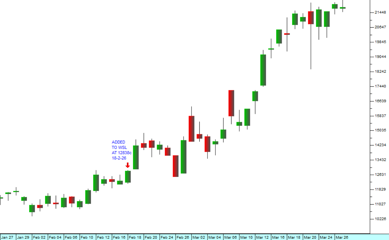 In view of this, we added Sasol to the Winning Shares List (WSL) on 18th February 2026 just as the war was beginning. At that time its shares were trading for 12838c. Since then, they have moved up to 21777c – a gain of almost 70% in 38 days. Consider the chart:
