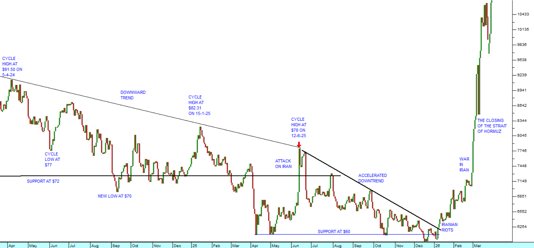 This shows that prior to Trump’s ill-advised war with Iran and the closure of the strait of Hormuz, the oil price was declining steadily. It was testing support at the $60 per barrel level. Now it is approaching double that price – and all because of the Israeli/American intervention. This is one problem that Trump definitely cannot blame on the Democrats because he is the indisputable cause of it.